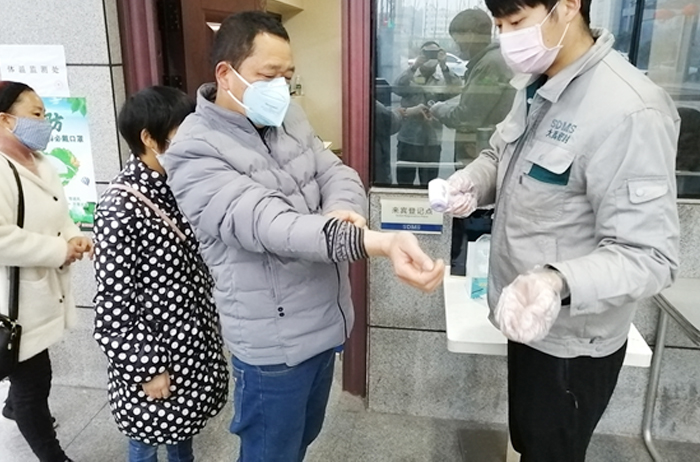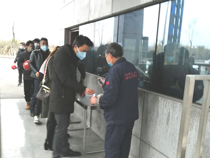 ??????復(fù)工首日始,全廠進行全面消毒,所有員工依次排隊進行體溫檢測、登記、消毒等、并再次每人發(fā)放口罩。